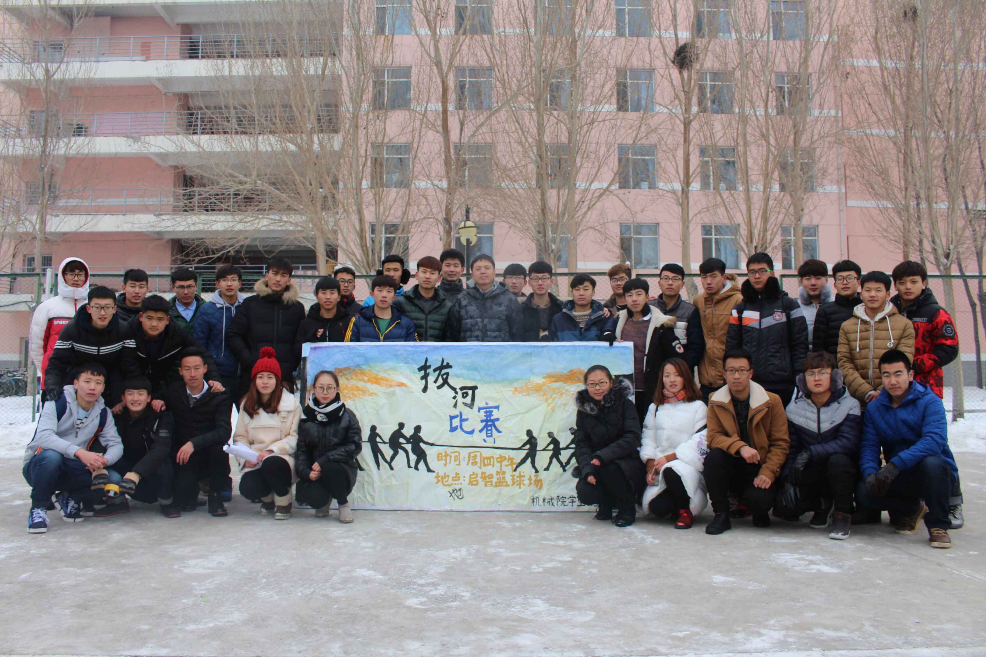 为了增强机械院学生的体质,增强机械院学生的凝聚力,11月10日至11日由机械院学生会体育部在启智4A篮球场举办了一场令人热血沸腾的拔河比赛。机械院2016级十五个班级的代表队参加了此次比赛。