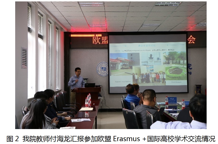 球盟会教师付海龙代表3位出访罗马尼亚普洛耶什蒂石油和天然气大学教师发言。他首先汇报了参加欧盟Erasmus+国际高校学术与教育交流大会的基本情况,并着重谈了此次参加会议的收获和体会,充分展示了欧盟框架下,世界高校进行国际教育交流强调互动性和多元化的大趋势,用切身感受说明了球盟会扩大国际合作与交流的必要性和紧迫性。