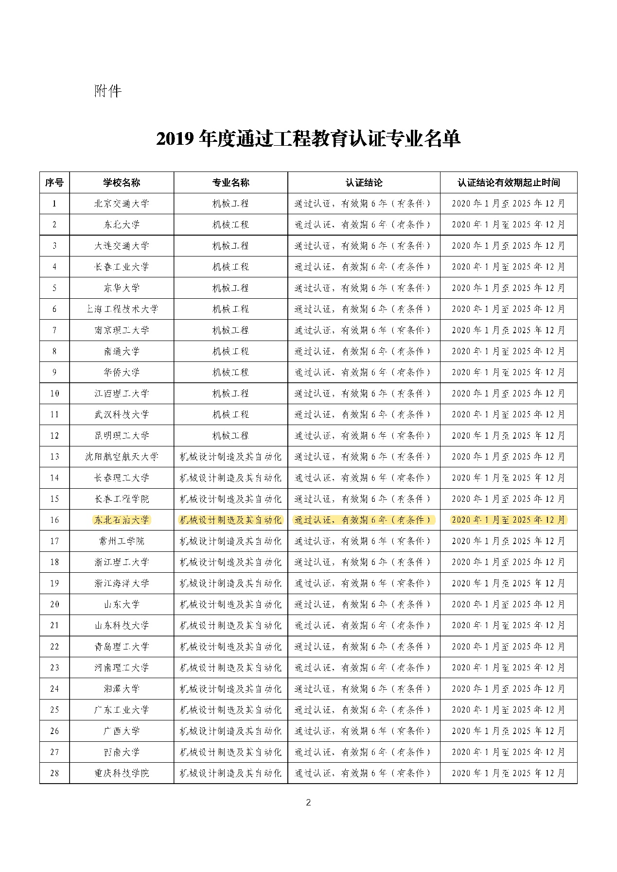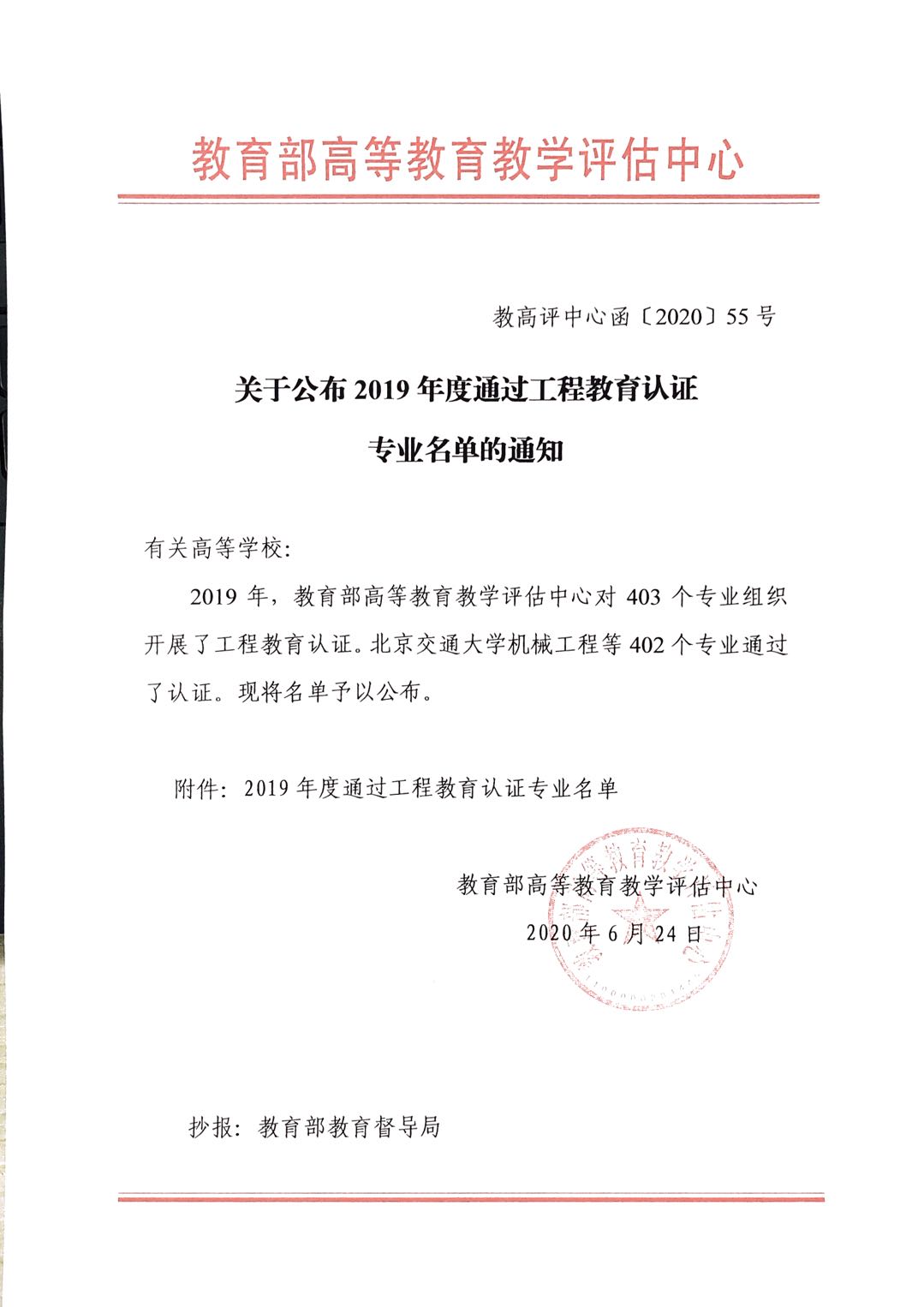 近日,教育部高等教育教学评估中心、中国工程教育专业认证协会正式发布了2019年工程教育专业认证结论。经过学校自评、专家组现场考查、分委员会审议、认证结论审议委员会审议等程序,全国高校共402个专业通过认证。球盟会机械设计制造及其自动化(简称机自)专业顺利通过认证,有效期为6年,即2020年1月至2025年12月。