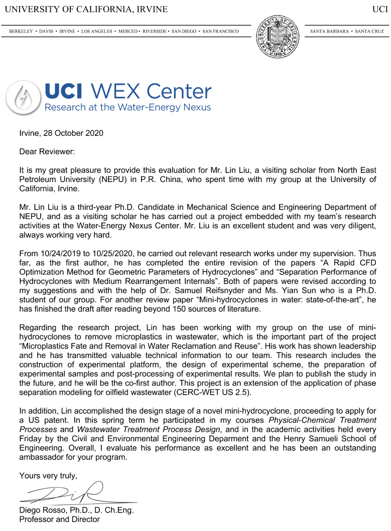 在美期间,刘琳进入加州大学尔湾分校Diego Rosso教授的环境过程实验室,尽管受到新冠肺炎疫情影响,该生始终保持积极乐观的心态和良好的学习习惯。在项目研究方面,他参与了中美合作项目“Phase separation modeling for oilfield wastewater (CERC-WET US 2.5)”研究。作为该项目的延伸,刘琳和实验室Yian Sun博士结合UCI与加州圣玛格丽塔自来水公司合作项目“Microplastics Fate and Removal in Water Reclamation and Reuse (SMWD)”,采用旋流器开展了活性污泥系统中的固液分离技术研究。国内导师赵立新就刘琳的研究工作、专利申请及论文撰写等,与UCI合作导师Diego Rosso通过线上或Email始终保持密切交流。