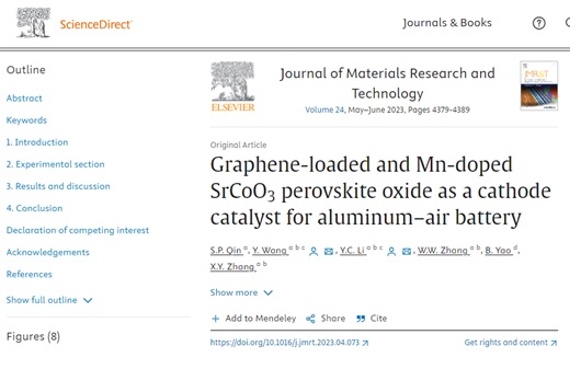 球盟会2020级硕士研究生秦善鹏在国际期刊《Journal of Materials Research and Technology》(IF=6.40,SCI top期刊)上发表题为“Graphene-loaded and Mn-doped SrCoO3 perovskite oxide as a cathode catalyst for aluminum–air battery”的研究论文(DOI:https://doi.org/10.1016/j.jmrt.2023.04.073)。