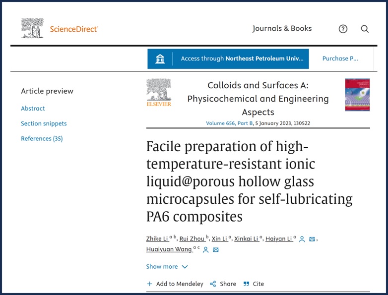 球盟会李志科副教授在国际期刊《Colloids and Surfaces A: Physicochemical and Engineering Aspects》(IF=5.2)上发表题为“Facile preparation of high-temperature-resistant ionic liquid@porous hollow glass microcapsules for self-lubricating PA6 composites”的研究论文(DOI:https://doi.org/10.1016/j.colsurfa.2022.13052)。