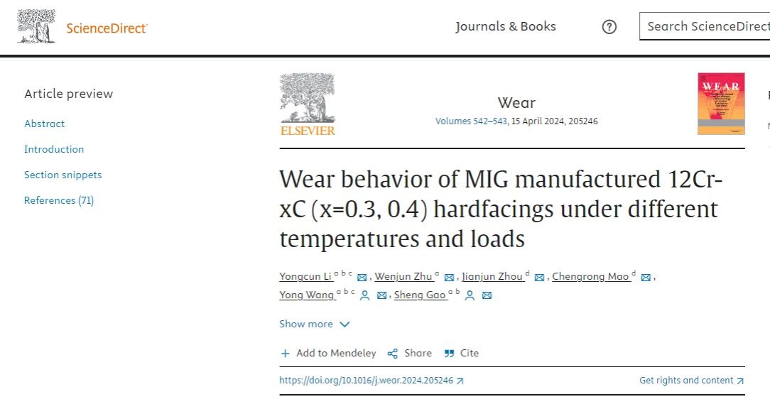球盟会2021级硕士研究生朱文俊在《Wear》(IF=5.0,中科院一区top期刊)上发表题为“Wear behavior of MIG manufactured 12Cr-xC (x=0.3, 0.4) hardfacings under different temperatures and loads ”的研究论文。(DOI:https://doi.org/10.1016/j.wear.2024.205246)。