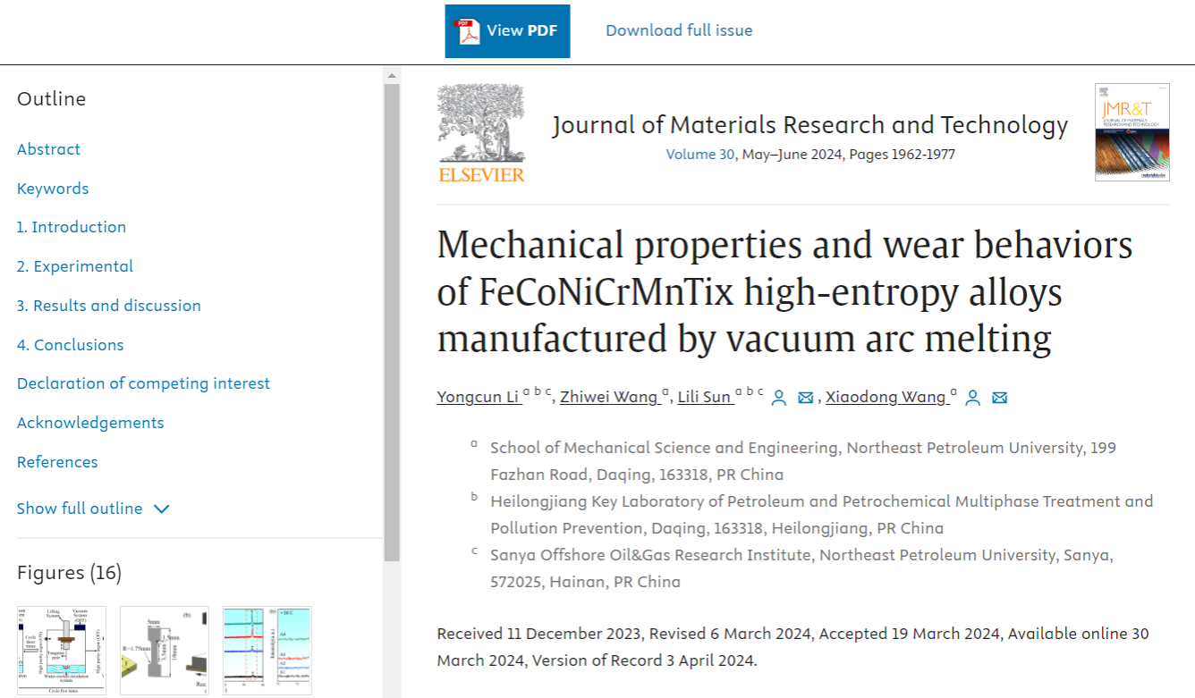 球盟会2022级硕士研究生王志伟在《Journal of Materials Research and Technology》(IF=6.40,SCI TOP期刊)上发表题为“Mechanical properties and wear behaviors of FeCoNiCrMnTix high-entropy alloys manufactured by vacuum arc melting”的研究论文(DOI:https://doi.org/10.1016/j.jmrt.2024.03.137)。