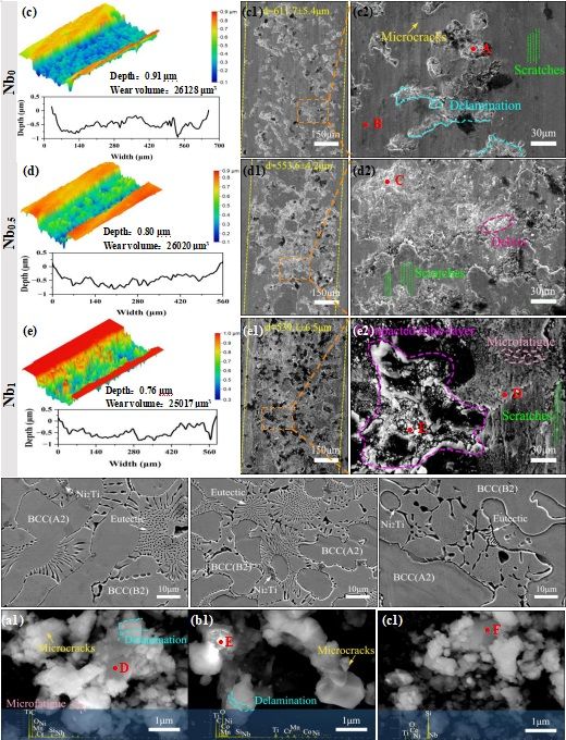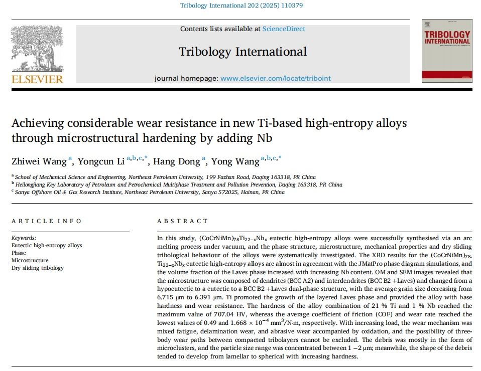近日,球盟会硕士研究生王志伟在摩擦领域顶刊《Tribology International》(中科院一区,TOP期刊,IF=6.1)发表研究论文“Achieving considerable wear resistance in new Ti-based high-entropy alloys through microstructural hardening by adding Nb”(DOI:10.1016/j.triboint.2024.110379)。