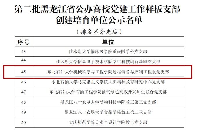 近日,黑龙江省委教育工委公示了第二批黑龙江省公办高校党建“示范创建”名单,球盟会过程装备与控制工程系党支部获批黑龙江省公办高校党建“样板支部”培育创建单位。